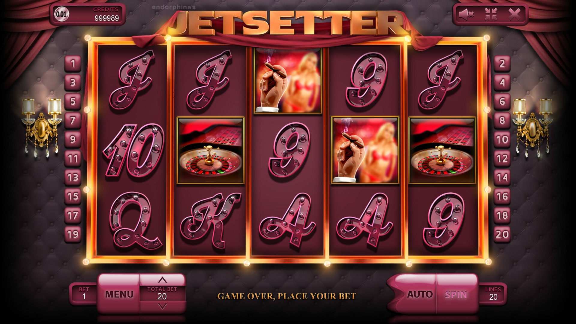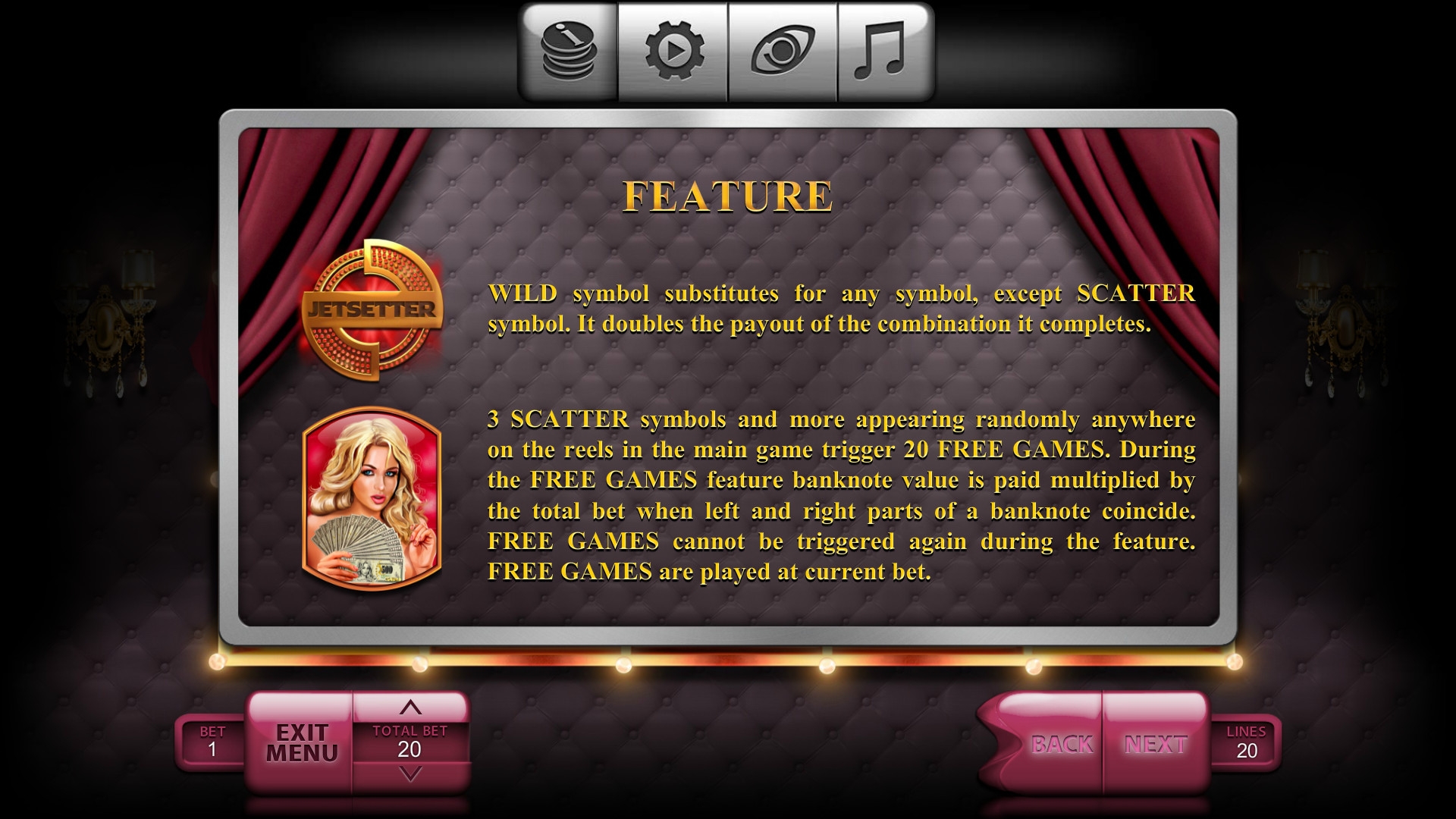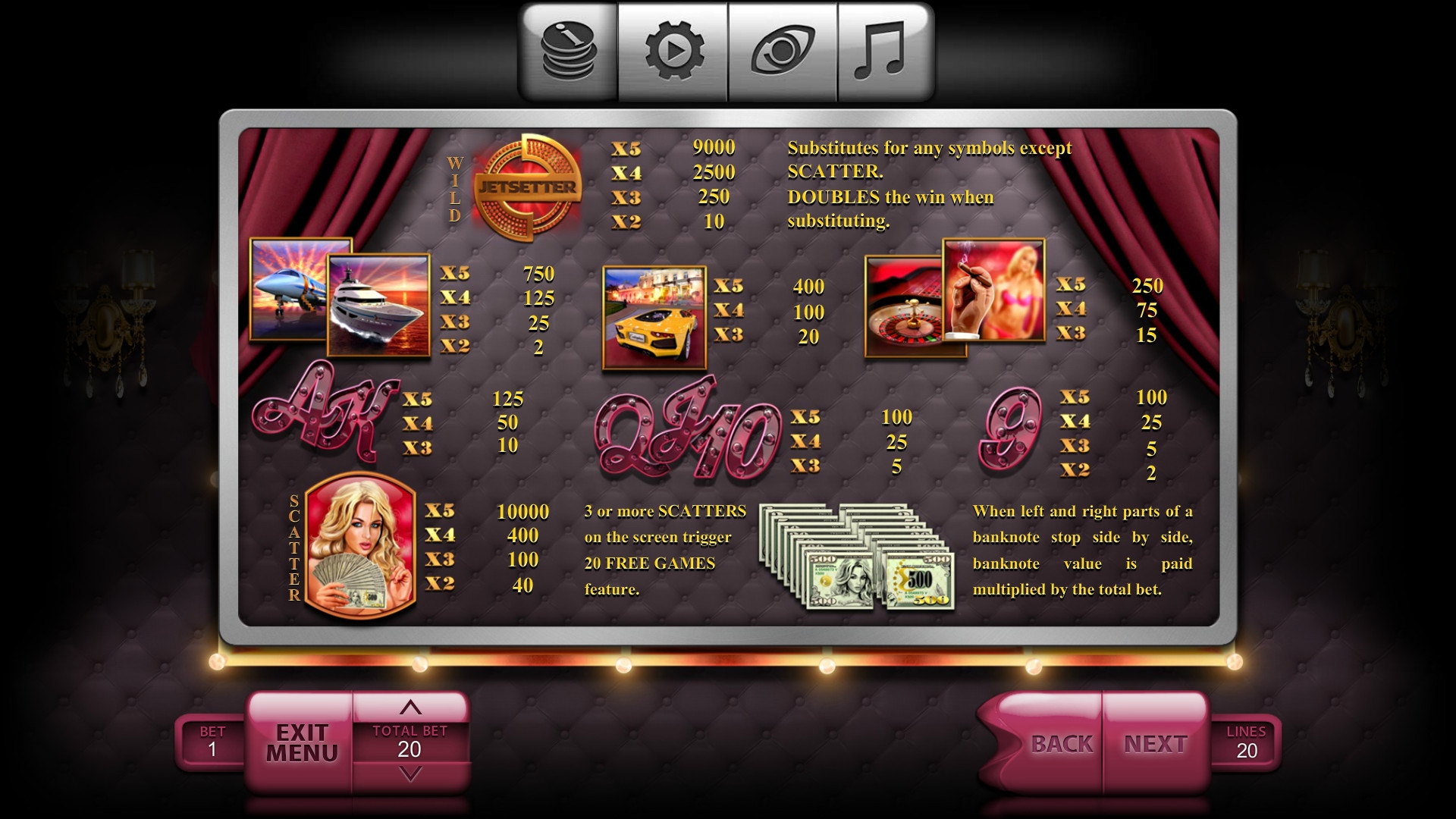 Самолет, яхта, гоночный автомобиль, рулетка, девушки модельной внешности и номиналы карт от девятки до туза – эти символы являются базовыми. Особыми возможностями наделены Wild (золотой медальон с надписью Jetsetter) и Scatter (блондинка с веером банкнот).