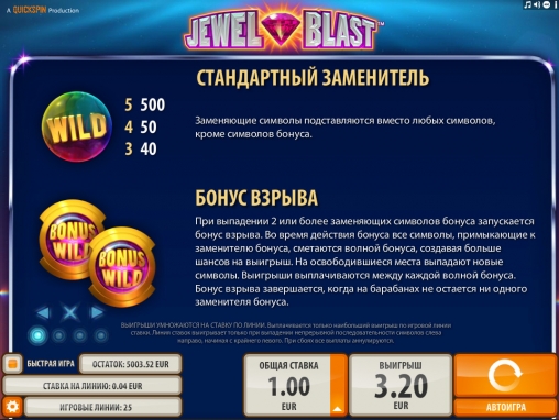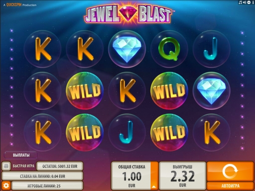 Осторожно тестируйте видео-слот Jewel Blast, которому посвящен данный обзор! В игре от компании Quickspin вас может накрыть взрывной волной! Хотя вряд ли вы расстроитесь, если с вами произойдет нечто подобное, ведь эта волна состоит из драгоценных камней, гарантирующих крупные выигрыши.