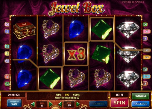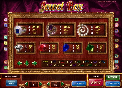 Jewel Box – видео-слот с пятью барабанами и пятнадцатью линиями. Пользователь может по своему усмотрению активировать нужное ему количество линий и выбрать на каждую из них ставку в одну – пять монет номиналом от одного до двадцати пяти центов. Это означает, что играть на игровом автомате Jewel Box разрешается максимум по восемнадцать долларов семьдесят пять центов на спин.