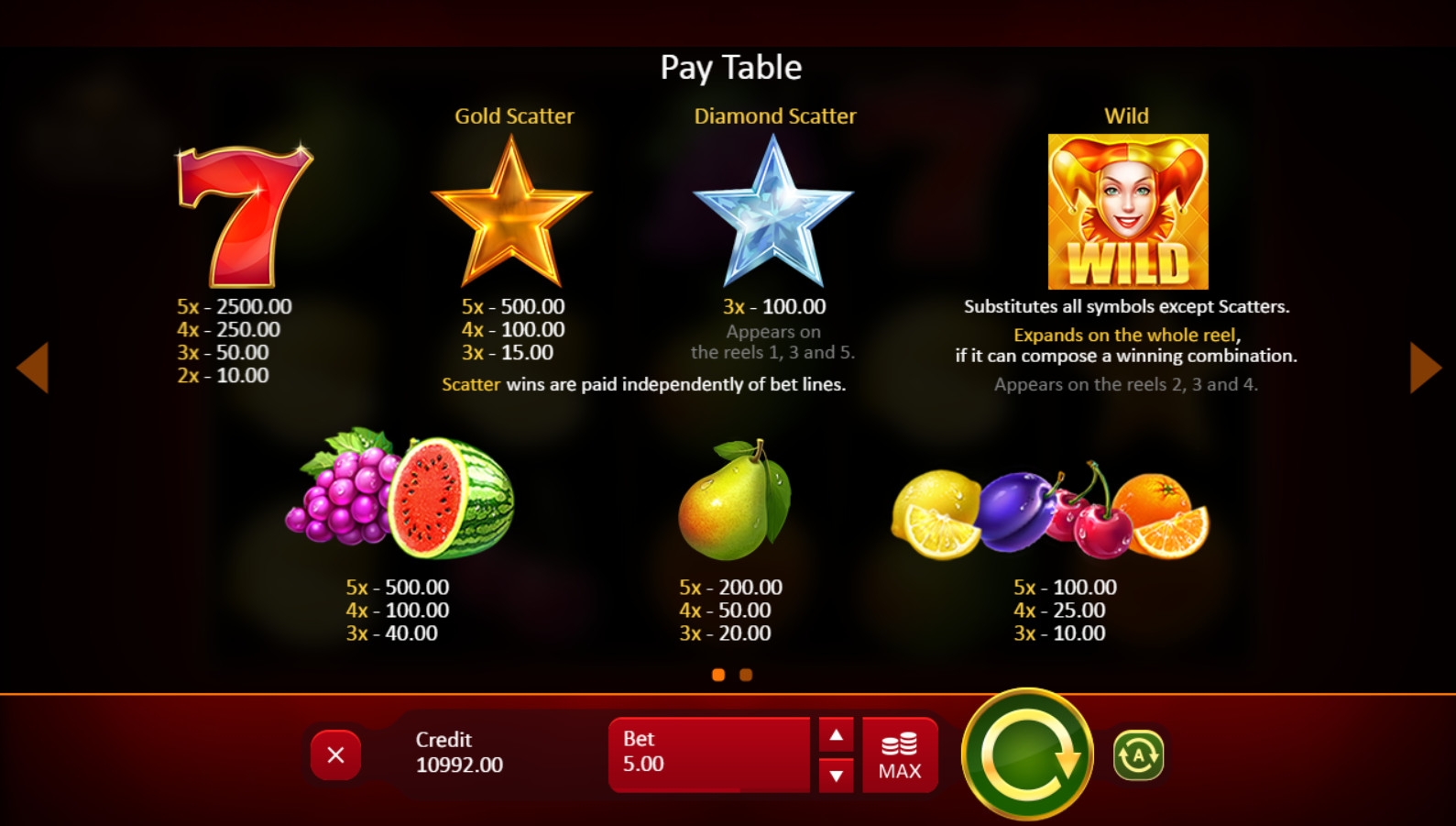 В роли базовых иконок выступают апельсины, вишни, лимоны и прочие фрукты-ягоды. Также на общих основаниях комбинации составляются из красных семерок.