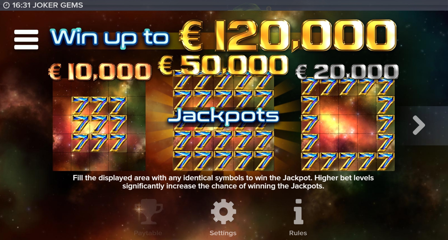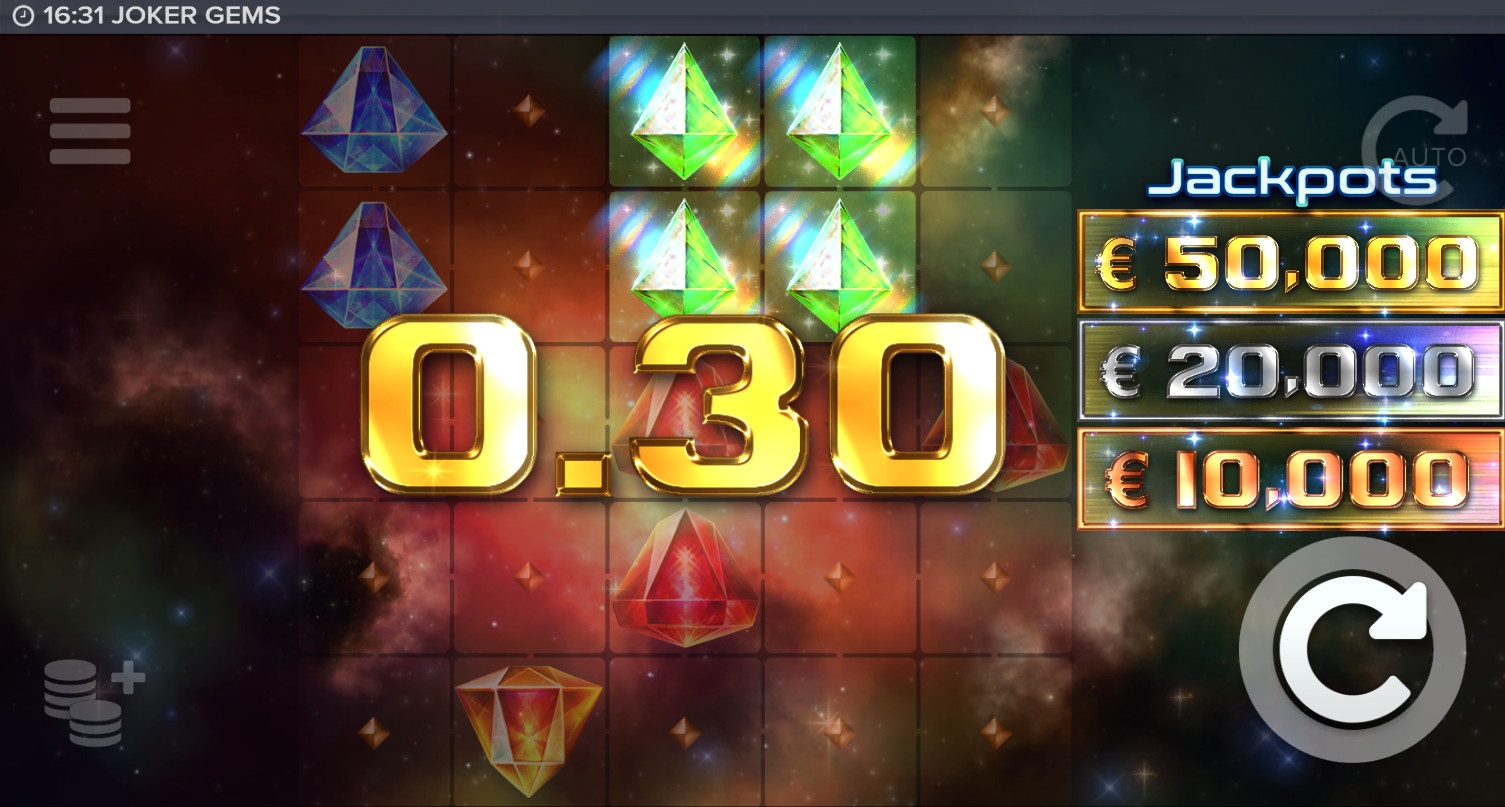 Накопительных джекпотов нет. В Joker Gems разыгрываются три фиксированных суммы. Чтобы получить одну из них, нужно заполнить выигрышными символами ячейки по определенным шаблонам.