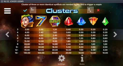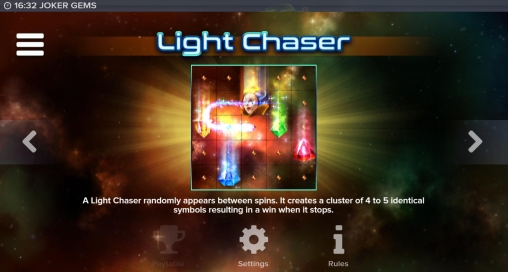 В Joker Gems задействованы семь иконок, респины, бонус Light Chaser и три джекпота.