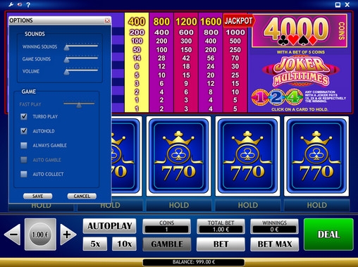 Играть в видео-покер Joker Multitimes можно по одной – пяти монетам. Их номинал может быть от десяти центов до двух евро. Соответственно, на раздачу принимается до десяти евро (на примере Casino 770).