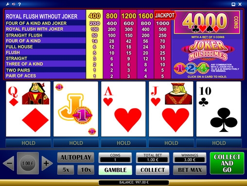 Максимальная выплата в Joker Multitimes равна четырем тысячам монет (она здесь называется джек-потом). Чтобы ее получить, нужно собрать натуральный роял флеш по ставке в пять монет. Эта выплата непропорционально завышена, если сравнивать ее с коэффициентами по другим ставкам, поэтому рекомендуется всегда играть в Joker Multitimes по пять монет.