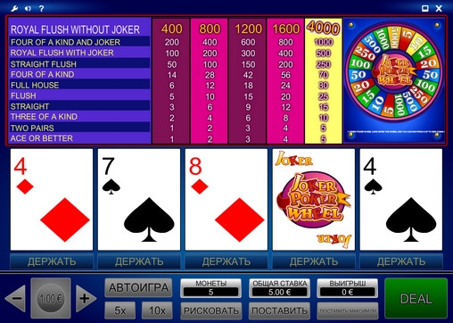 Видео-покер Joker Wheel Poker целиком переведен на русский язык, включая надписи на кнопках, раздел с правилами, диалоговые окна и так далее.