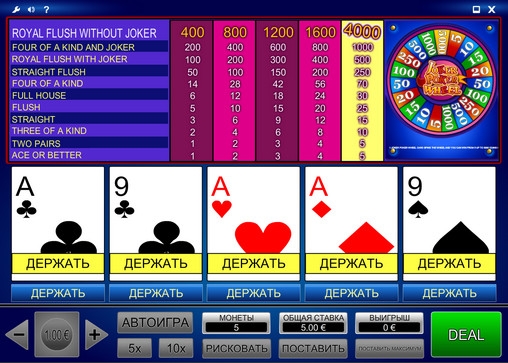 Joker Wheel Poker – виртуальный видео-покер, который играется стандартной колодой в пятьдесят два листа. К ним добавлены два джокера: один обычный, другой бонусный. Оба они заменяют недостающие символы в комбинациях, а Bonus Joker также запускает колесо фортуны, о чем читайте ниже.