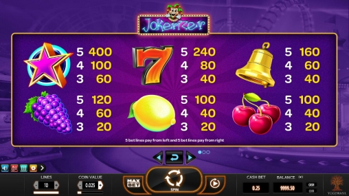 Комбинации в Jokerizer образуются, на самом деле, всего на пяти линиях, но происходит это с двух сторон. То есть, пять активных линий слева направо и пять активных линий справа налево. Для получения выплаты необходимо, чтобы не менее трех одинаковых картинок выпали рядом друг с другом на линии, начиная с первого или последнего барабана.