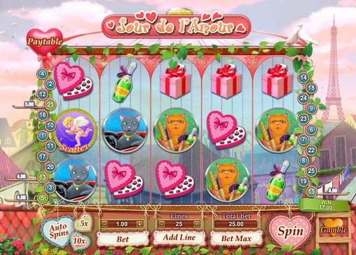 Jour de l’Amour – пятибарабанный игровой автомат с двадцатью пятью линиями, количество которых можно активировать по своему усмотрению. Картинки на экране выстраиваются в три ряда.