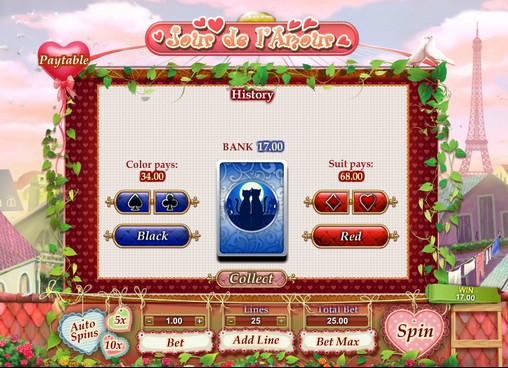 В видео-слоте Jour de l’Amour предусмотрены особые символы, несколько бонусных раундов, бесплатные запуски, рискованная игра по шансам и другие опции.