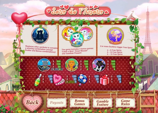 Не желаете провести день в Париже в обществе местных кошек, которых охватили любовная лихорадка? Да, предложение не самое заманчивое, если учесть, как себя ведут влюбленные коты. Но речь идет не о настоящей поездке, а о забавном видео-слоте Jour de l’Amour («День любви»), посвященном таким вот персонажам. Этот бесплатный игровой автомат онлайн выпустила известная компания GamesOS, ранее известная как CTXM, а портал Casinoz подготовил для вас его подробный обзор с описанием всех функций и возможностей.