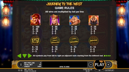 Journey to the West представляет собой пятибарабанный видео-слот с двадцатью пятью фиксированными линиями и пятнадцатью картинками на основном экране.