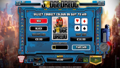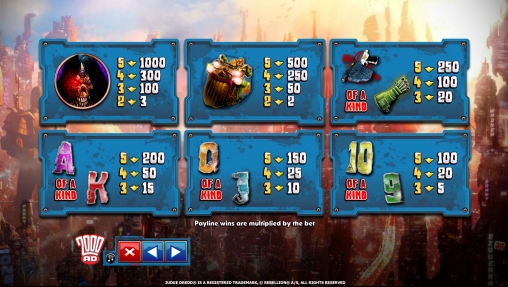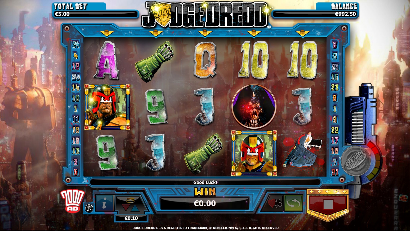 Разрешается играть на игровом автомате «Судья Дредд» только по всем двадцати пяти активным линиям. Поставить на каждую позицию можно от одного цента до двух евро. Соответственно, на спин принимается до пятидесяти евро.