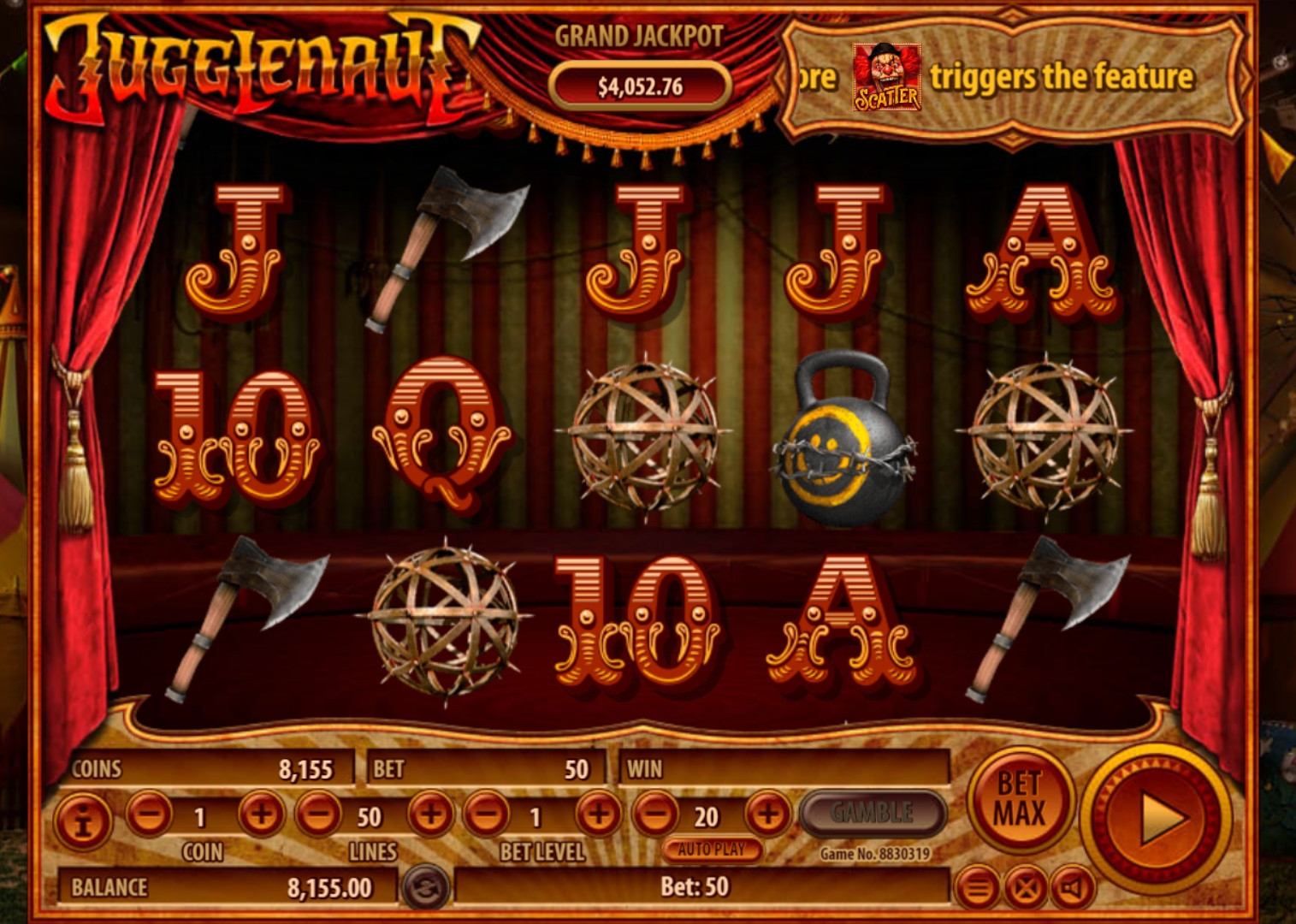 Разработчики из компании Habanero приглашают вас заглянуть в цирк, который дает представления в видео-слоте Jugglenaut. Только не вздумайте брать с собой детей, беременных женщин или особо впечатлительных родственников! Труппу мрачного шапито составляют артисты, способные ужаснуть даже людей с крепкими нервами. А главным персонажем игры стал жонглер, лихо управляющийся с топорами, бензопилами, колючими стальными шарами и другими опасными предметами. Со всеми особенностями жуткого автомата вас познакомит обзор от Casinoz.