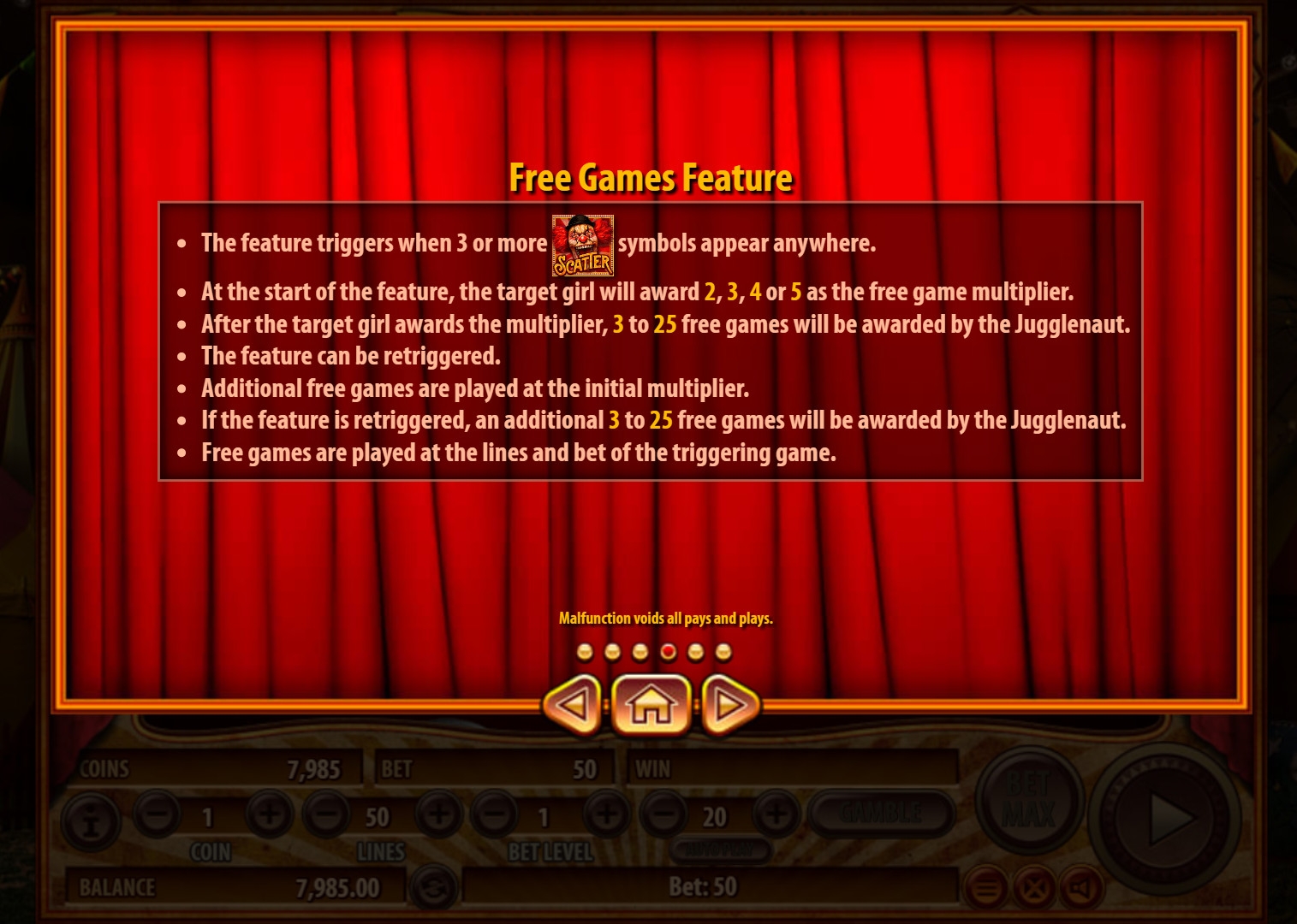 - Free Games – Перед началом бесплатных спинов появляется девушка. Она запустит барабан, определяющий размер дополнительного множителя (до х5). Он будет учитываться при расчете выигрышей. Далее вы увидите жонглера, который выяснит, сколько фри-спинов вам полагается. Их может быть до двадцати пяти. После этого начнутся розыгрыши, которые могут быть продлены тремя и более скаттерами.