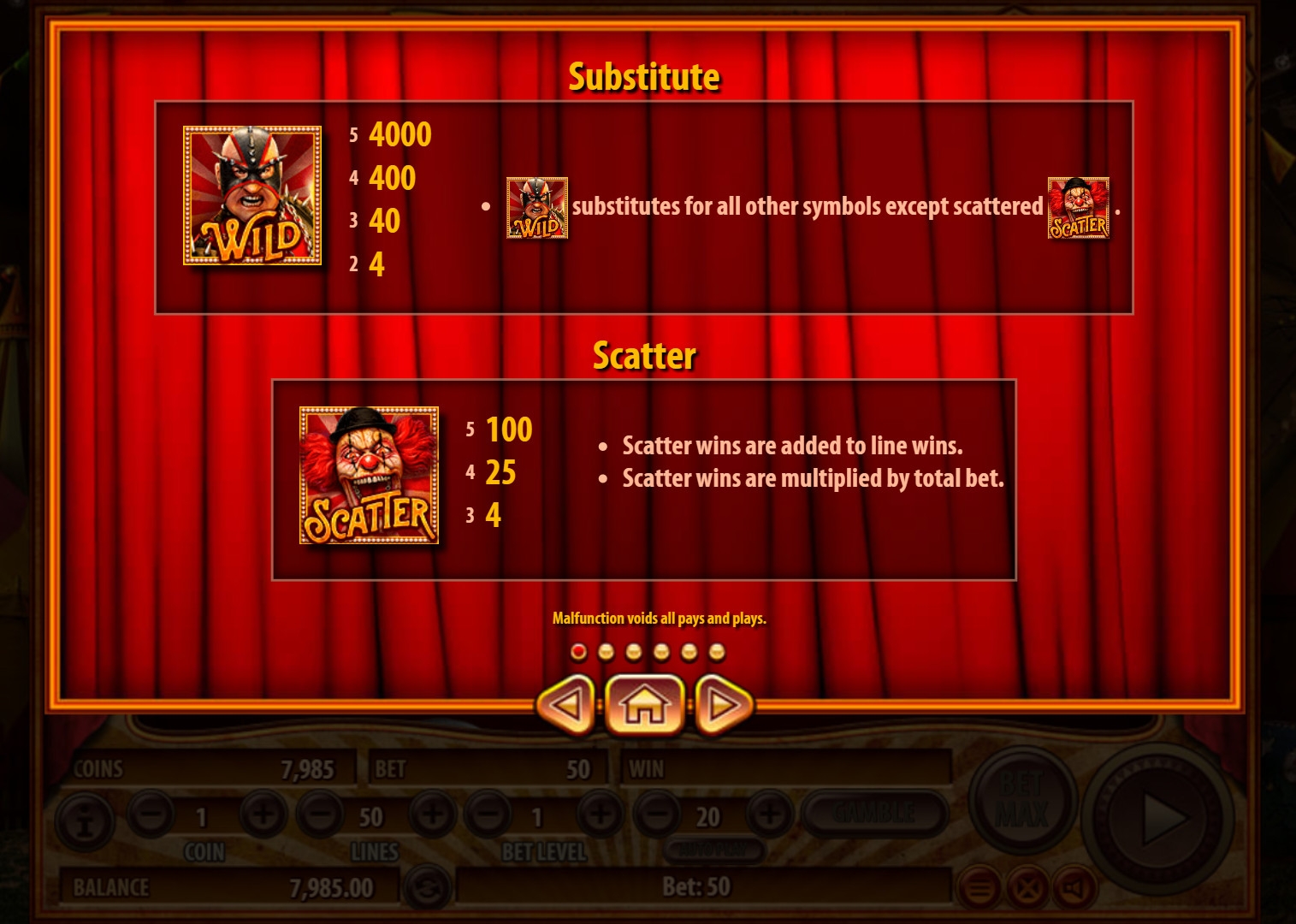 - Scatter (клоун) не привязан к активным полосам и составляет выигрышные последовательности независимо от расположения. Выплаты рассчитываются по общей сумме, стоящей на кону. От трех скаттеров начинают фри-спины.