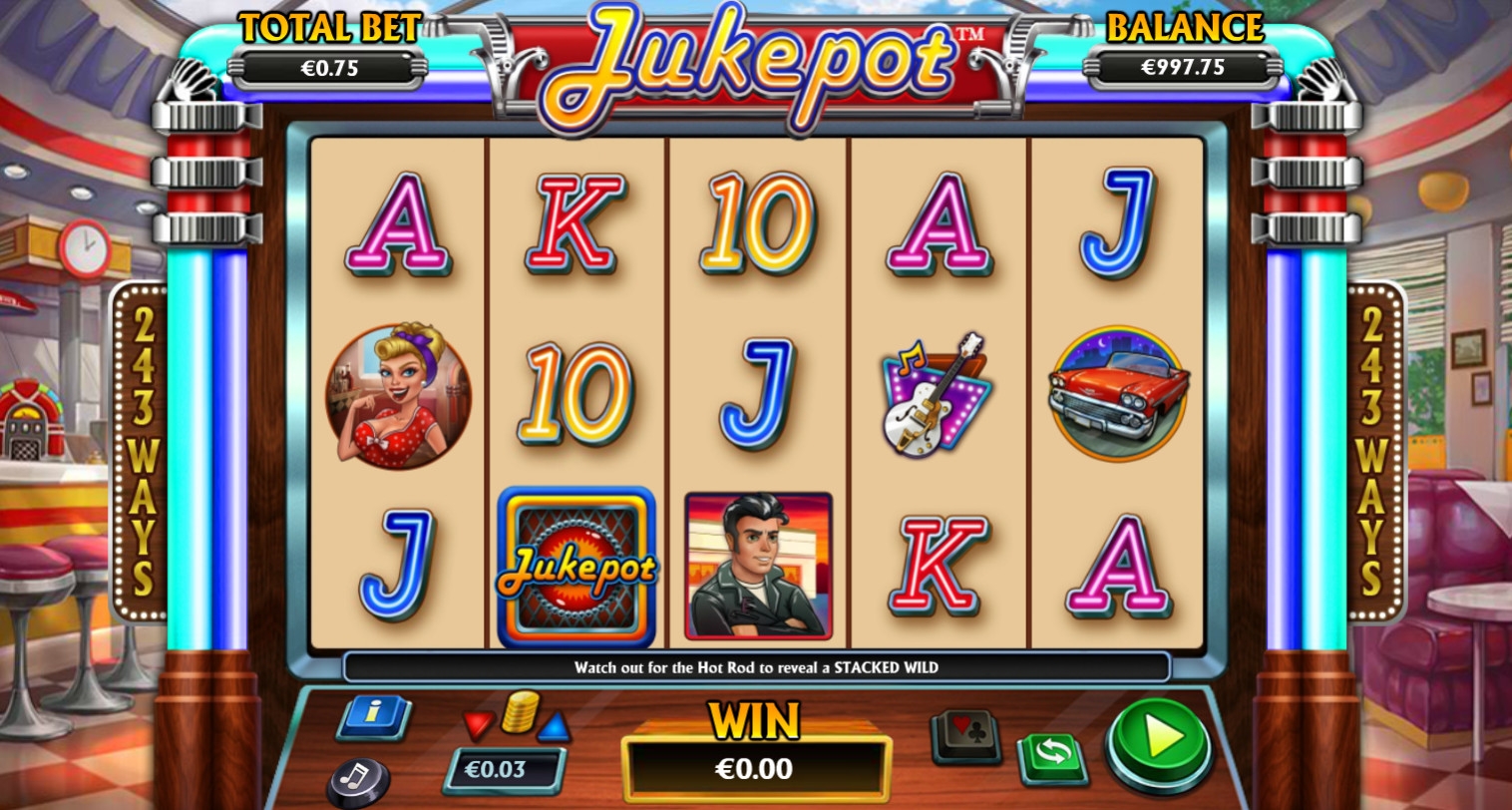 Видео-слот Jukepot – это пятибарабанная игра с 243 способами формирования комбинаций. Активные линии правилами не предусмотрены. Картинок на экране пятнадцать (5х3).