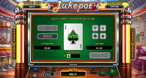 Выигрыш можно забрать или поставить на кон в риск-игре. Здесь необходимо угадать цвет или масть карты, чтобы выплата увеличилась в два или четыре раза. Неправильный ответ лишает вас ставки. Подряд можно играть до пяти раз.