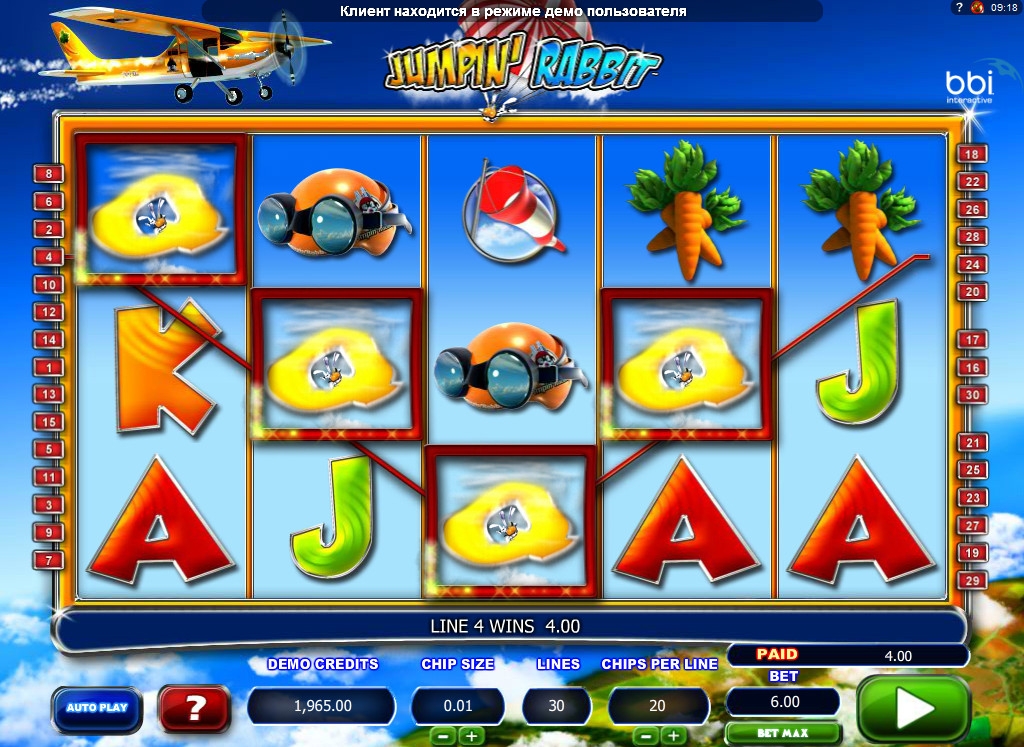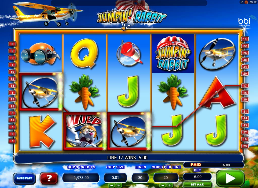 Кролик, с которым вы познакомитесь в видео-слоте Jumpin’ Rabbit, - большой оригинал. Ему недостаточно быстро скакать по земле на своих четырех лапах – он предпочитает более быстрое перемещение в пространстве. Поэтому он стал пилотом аэроплана и теперь носится, как молния, в облаках. Правда, иногда ему не удается удержаться в кабине на самых крутых виражах, но он всегда остается в живых и продолжает заниматься любимым делом.