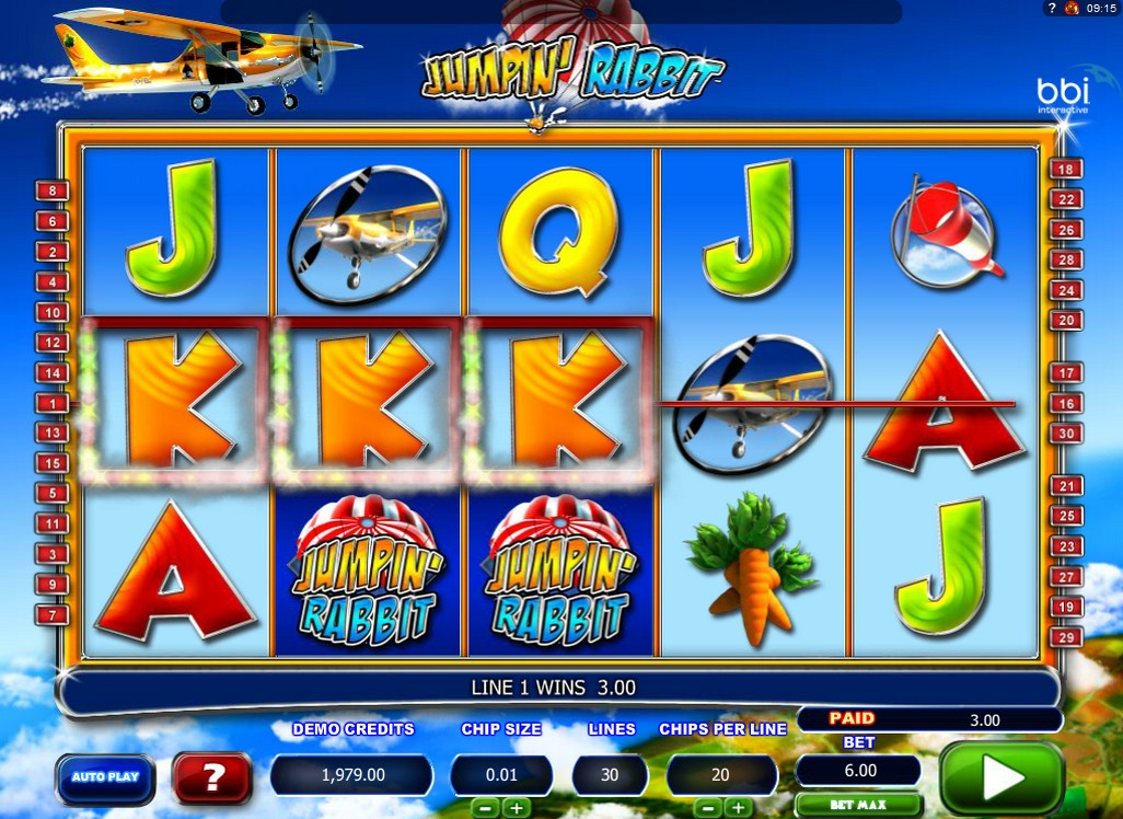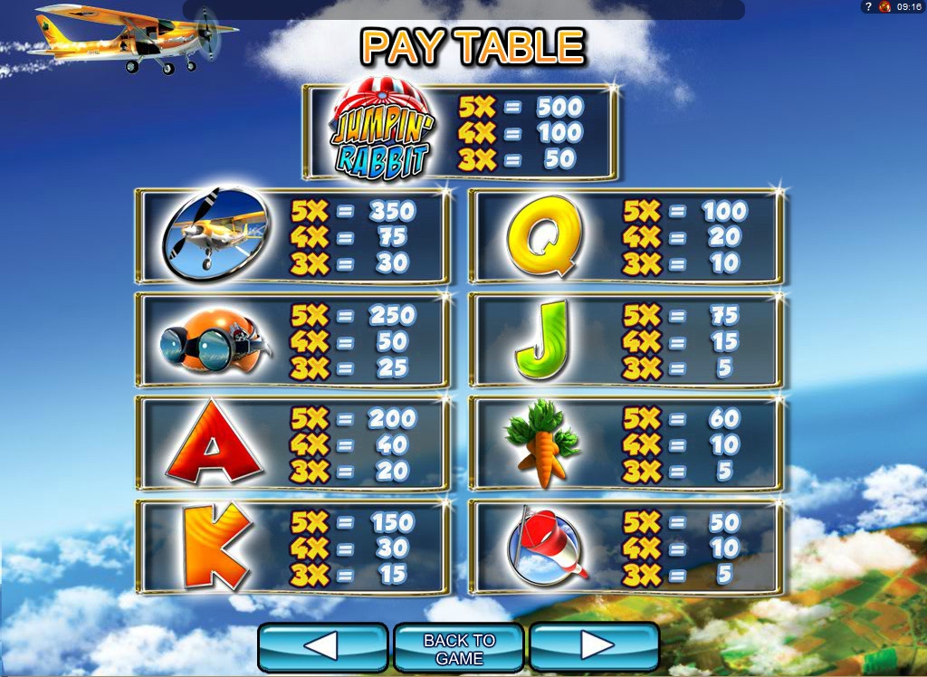 На экране игрового автомата можно увидеть логотип Jumpin’ Rabbit, шлем кролика, его самолет, морковку, конус-ветроуказатель, а также буквы, обозначающие номиналы карт от валета до туза.