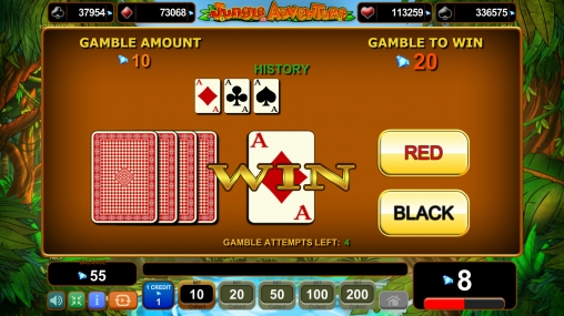В Jungle Adventure разыгрываются традиционные для слотов EGT накопительные джекпоты. Четыре накопительных суммы названы по мастям карт. Побороться за одну из них можно в специальном раунде. Он запускается случайным образом в любом базовом спине.