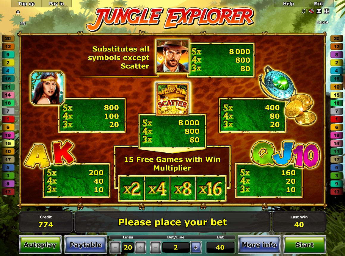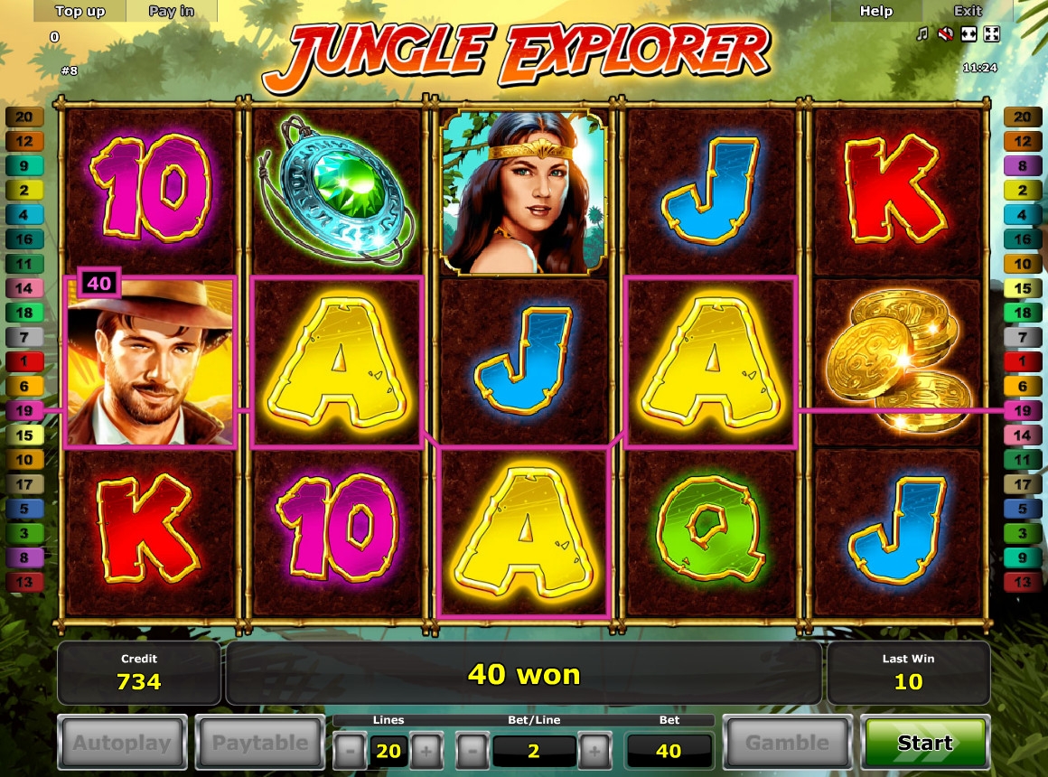 Компания Novomatic представила игровой аппарат Jungle Explorer, ориентированный на любителей приключений и путешествий по неизведанным уголкам планеты. Его героем стал отважный путешественник, который не побоялся отправиться в непролазные джунгли в поисках сокровищ древних индейцев. Эта модель привлекает выгодными условиями формирования комбинаций, а также разнообразием всевозможных дополнительных опций, о которых вы узнаете из обзора от Casinoz.