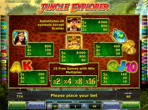 «Исследователь джунглей» - это 5-барабанный видео-слот для интернет-казино. В нем двадцать фиксированных линий, на которые принимаются равные ставки в диапазоне от двух до пятисот монет. Так что на спин принимается не менее сорока кредитов и не более десяти тысяч.