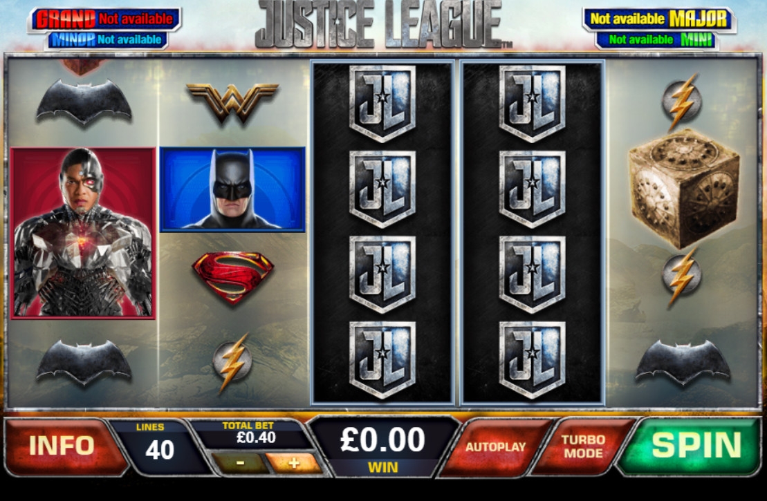 Justice League – игровой автомат с пятью барабанами, на котором разрешается играть только по сорока полосам. Картинки на экране выстраиваются в четыре ряда, но некоторые символы занимают до четырех ячеек по вертикали в колонках.