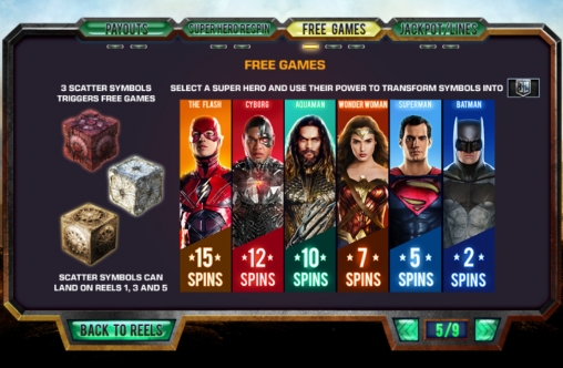 - Wonder Woman – семь спинов; с каждым запуском появляются до пяти новых рамок, превращающих героев в символы Wild.