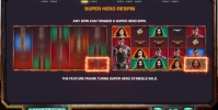 - Super Hero Respin – Повторный спин проходит на деньги интернет-казино. Он может запуститься после любого обычного розыгрыша. Огненная рамка выделит одну из ячеек. Оказавшийся здесь супергерой станет дополнительным джокером. Респины могут продолжаться до пяти раз кряду, превратив до пяти персонажей в символы Wild.