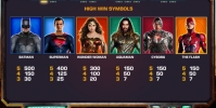 На экране видео-слота появляются персонажи фильма «Лига справедливости». Вы увидите Бэтмена, Супермена, Чудо-женщину, Аквамена, Флэша и Киборга. Каждый из них может занимать от одной до четырех ячеек подряд в колонках. Также на барабанах изображены логотипы Бэтмена, Супермена, Чудо-женщины и Флэша.