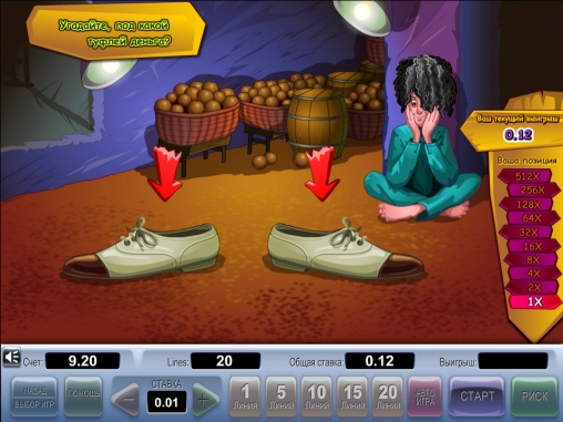 Все деньги можно сразу вывести на счет или поставить на кон в игре по равным шансам. Если вы отдадите предпочтение второму варианту, на дополнительном экране появится персонаж Георгия Вицина. Перед ним будет две туфли. Вам нужно будет выбрать одну из них. Если под ней окажется купюра, выплата удвоится. Если там будет таракан, вы лишитесь ставки.