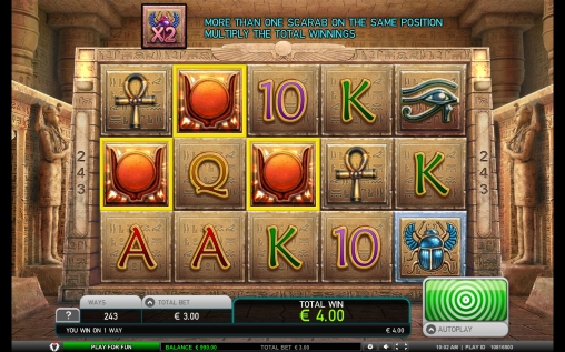 «Хепри – Вечный бог» – это 5-барабанный слот без активных линий, в котором выигрышные цепочки образуются из картинок, выпадающих где-нибудь на соседних барабанах, начиная с первого. Всего предусмотрено 243 варианта формирования таких комбинаций из одинаковых символов.
