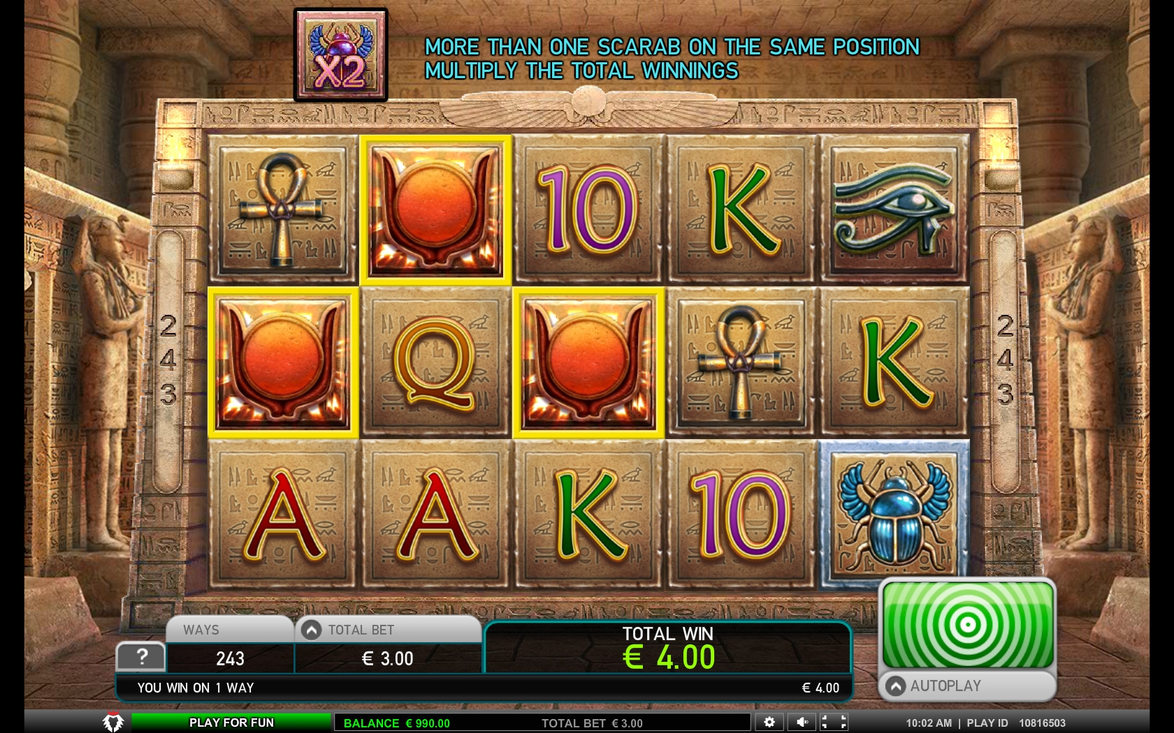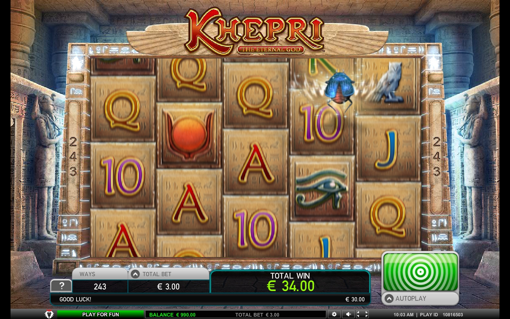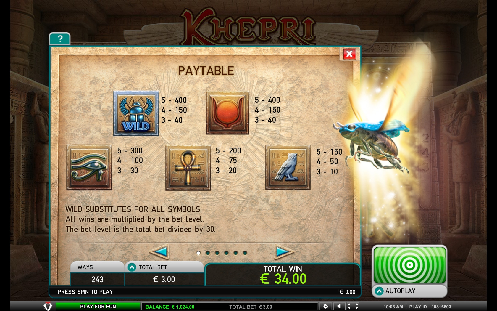 Клиенты могут играть на игровом автомате Khepri – The Eternal God по ставке, кратной тридцати. Она принимается сразу на раунд. Диапазон варьируется от тридцати центов до трехсот евро.