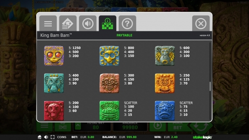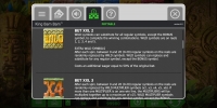 King Bambam – пятибарабанный видео-слот с двадцатью ячейками для картинок на главном экране. Играть можно только по сорока задействованным полосам. Диапазон ставок по каждой из них варьируется от одной до пяти монет номиналом от цента до двадцати. Выходит, что на спин разрешается ставить не менее сорока центов и не более сорока долларов (лучше уточнить в казино).
