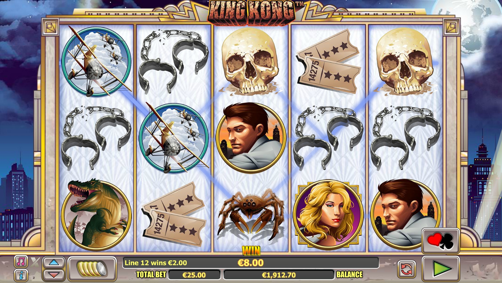 King Kong представляет собой 5-барабанную модель с постоянно задействованными двадцатью пятью линиями, на которых формируются комбинации. Предусмотрен определенный диапазон ставок на одну полосу: 0.01, 0.02, 0.05, 0.10, 0.20, 0.25, 0.50, 1 или 2 евро. Получается, что на спин нельзя поставить меньше двадцати пяти центов или больше пятидесяти евро (на примере Slots Million).