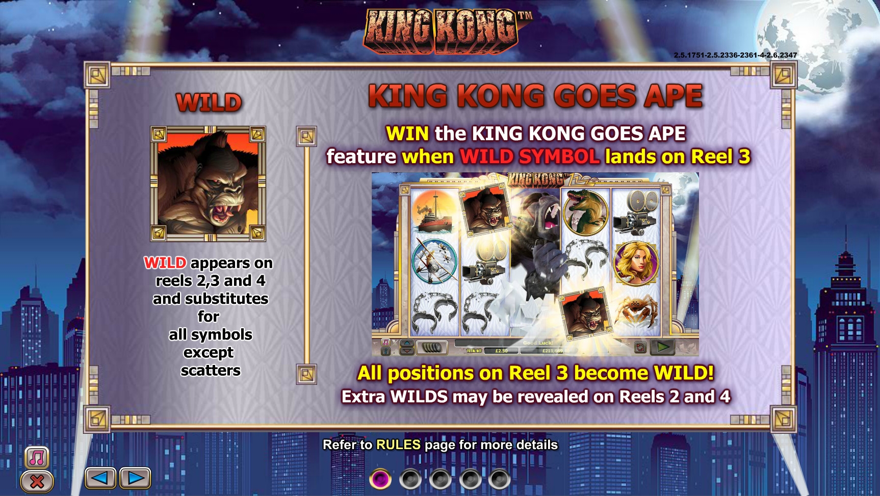 - King Kong Goes Ape – Когда Wild выпадает на третьем барабане, он занимает все три позиции в данной колонке. Также он может превратить в себе подобные картинки случайно выбранные элементы во втором и четвертом столбцах. Затем происходит формирование комбинаций.