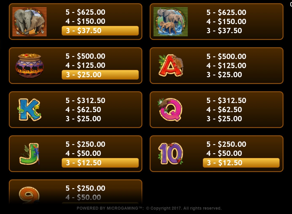 Вы увидите на экране видео-слота шесть карточных номиналов, вазу и слонов. Одинаковые иконки часто следуют в колонках вертикальными стеками.