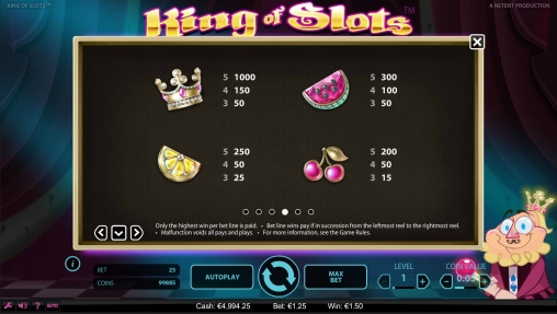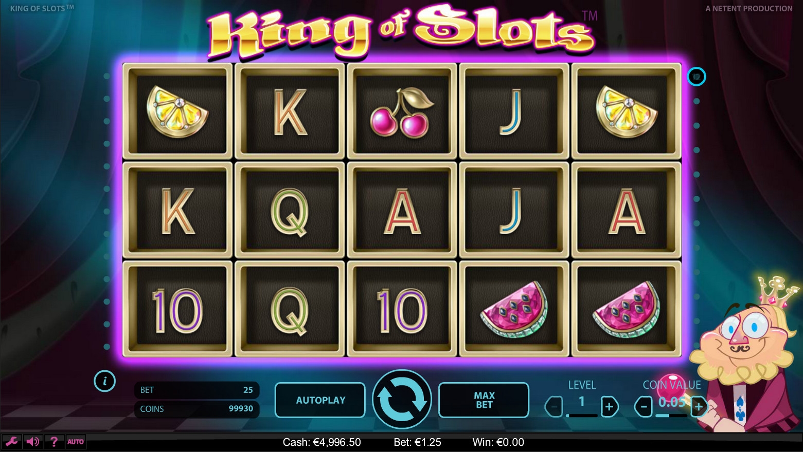 King of Slots представляет собой 5-барабанный видео-слот с двадцатью пятью постоянно задействованными линиями. На них принимаются равные ставки в диапазоне от одной до десяти монет достоинством 0.01, 0.02, 0.05, 0.10, 0.20, 0.50 или 1 евро. Получается, что на раунд принимается от двадцати пяти центов до двухсот пятидесяти евро.