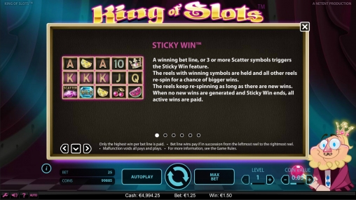 В «Короле слотов» действует вышеупомянутая функция Sticky Win. При формировании на экране любой оплачиваемой комбинации, составляющие эту цепочку символы остаются на месте, а остальные картинки меняются на новые. Если образуются дополнительные варианты, процесс продолжается. На каждом шаге начисленные выплаты накапливаются. Теоретически, Sticky Win может продолжаться, пока все ячейки не будут заполнены «липкими» символами.