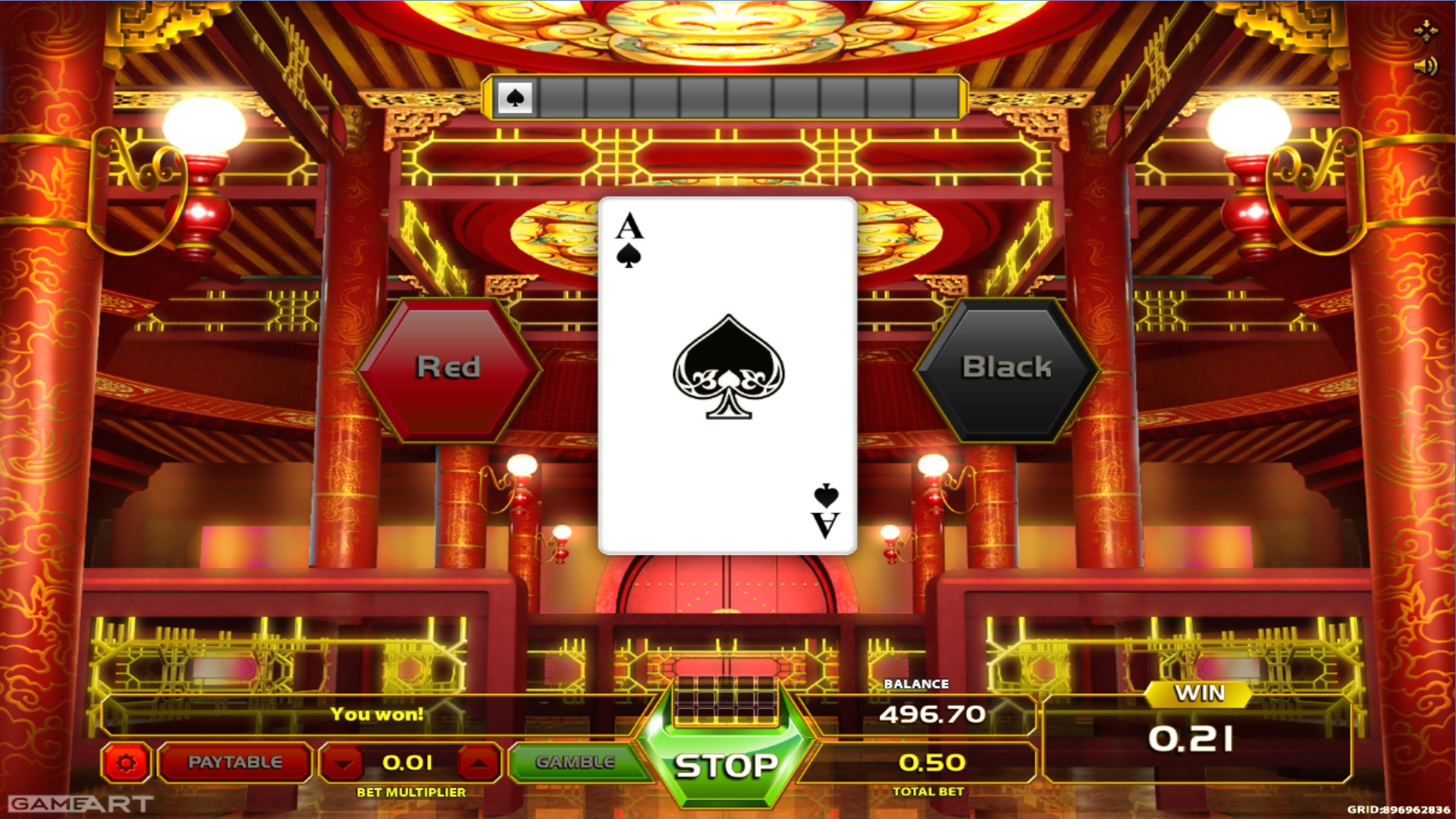Получив выплату любого размера, вы можете запустить игру по равным шансам, где нужно угадывать цвет закрытой карты. Правильный ответ удваивает сумму, а ошибка приводит к немедленному проигрышу ставки. Подряд можно действовать до пяти раз.