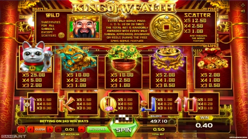 В игровом автомате King of Wealth пять барабанов и пятнадцать символов на экране. Это модель без активных полос, в которой предусмотрены 243 способа формирования выигрышных цепочек.