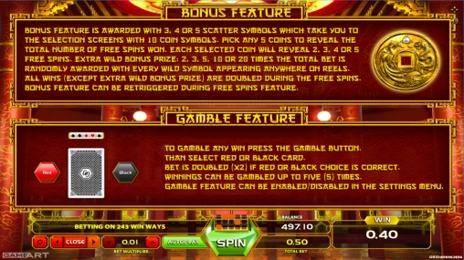 - Bonus Feature – Сначала на экране появляются десять монет, которые скрывают по два, три, четыре или пять фри-спинов. Вы должны выбрать пять элементов, чтобы определить общее количество бесплатных вращений. Затем начинаются бонусные спины на деньги казино. Все коэффициенты здесь удваиваются. Каждый символ Wild, выпадающий на барабанах, дает приз в размере от двух до двадцати общих ставок. Спины могут быть продлены.