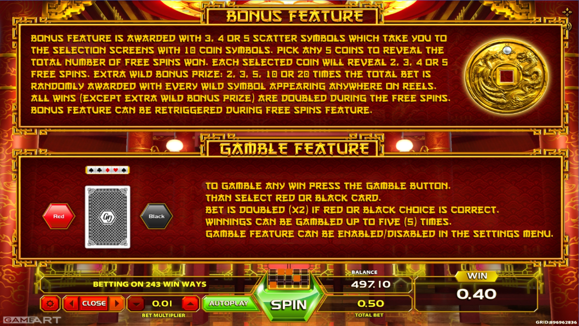 Обычные изображения образуют комбинации из нескольких одинаковых элементов, оказывающихся где-нибудь в соседних колонках, включая первую. Размер выплаты определяется умножением стоимости монеты на коэффициент полученной цепочки. Он бывает от х10 до х2500.