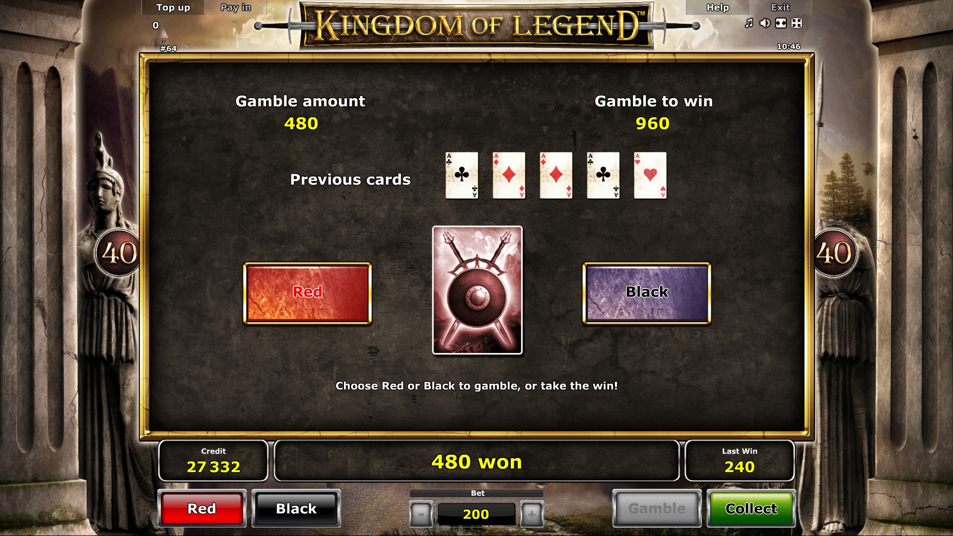 В Kingdom of Legend есть раунд на удвоение, который запускается по желанию клиента. Он выдержан в классическом стиле «угадай цвет карты». Детали вы сможете выяснить в таблице.
