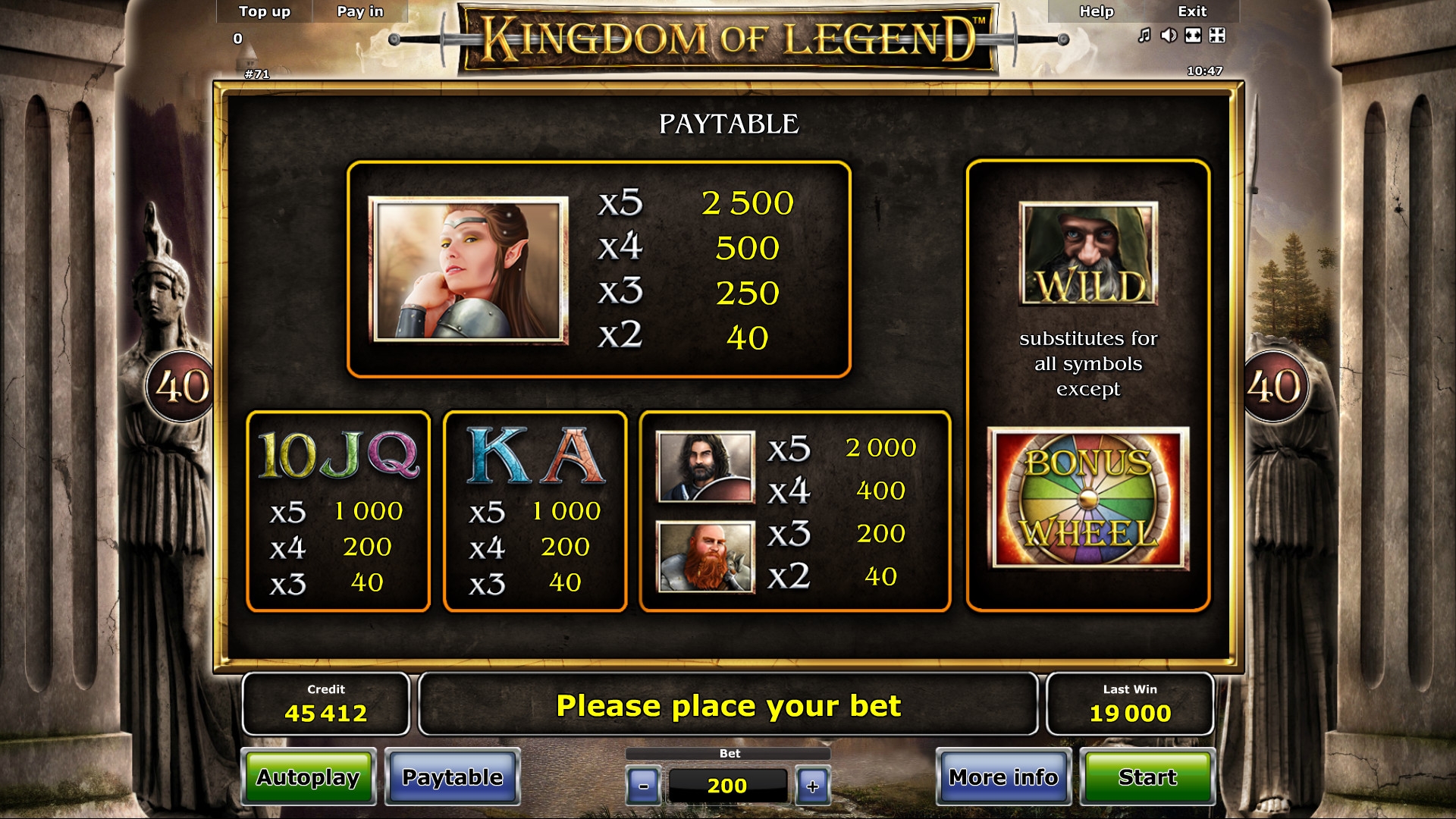 Разработчики из Novomatic предлагают любителям фэнтези перенестись в сказочный мир игрового аппарата Kingdom of Legend, который населяют эльфы, колдуны, орки, гномы и рыцари. Вас ждет невероятный экшен по всем законам жанра, а также многочисленные выплаты, начисляемые разными способами. Читайте обзор от Casinoz и спешите испытать новинку лично.