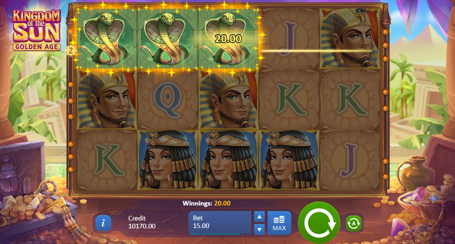 В видео-слоте «Царство солнца: Золотой век» пять барабанов и пятнадцать фиксированных линий. Картинки на экране выстраиваются по сетке 5х3.