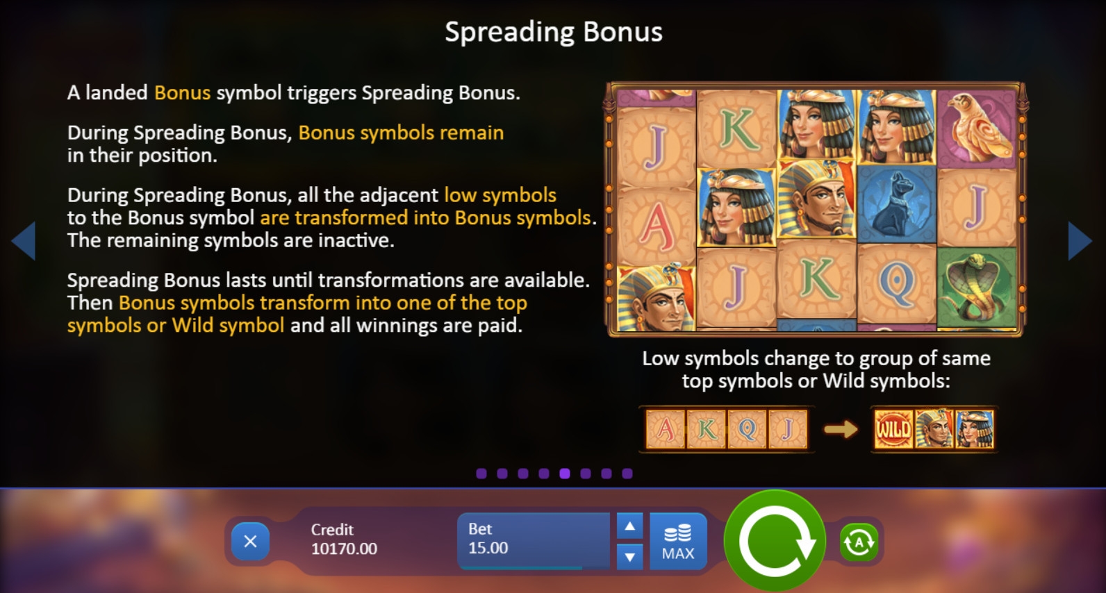 - Spreading Bonus – Раунд начинается даже одним бонусным символом в первой колонке. Все эти картинки остаются на экране. Затем начинается респин. Если в ходе вращения на смежных с Bonus позициях выпадают карточные номиналы, они также превращаются в бонусные иконки и запускают новый респин. Повторные вращения завершаются, когда очередной респин не приносит дополнительных букв или при заполнении всего экрана символами Bonus. Затем они превращаются в одну из высокооплачиваемых картинок или Wild.