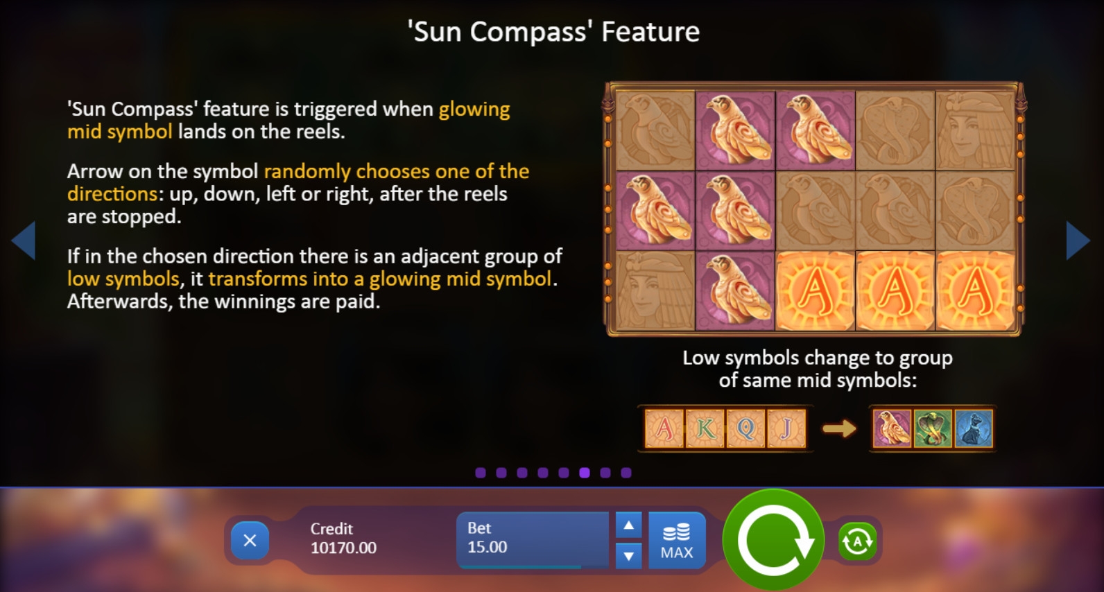 - Sun Compass Feature – Любая картинка серии Mid может появиться в сияющей версии. В таком случае она становится компасом. Вращающаяся стрелка указывает на одну из четырех сторон. Если в данном направлении находятся смежные буквы, они превращаются в одинаковые элементы среднего типа: сокола, кота или кобру. Далее начисляются выплаты по сложившимся комбинациям.