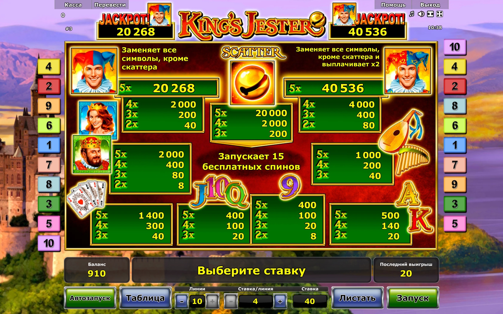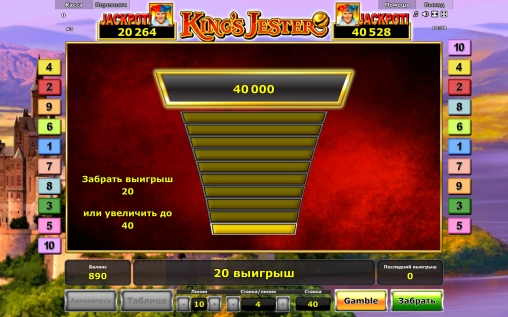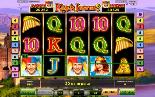 King’s Jester – онлайн видео-слот производства компании Novomatic. В нем пять барабанов и десять линий. Количество активных полос клиент может определять по своему усмотрению. Ставки по ним всегда равны. Они бывают от четырех кредитов до одной тысячи. Таким образом, на спин можно поставить не менее четырех и не более десяти тысяч.