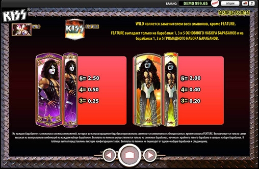 Специальных символов в видео-слоте Kiss два: Wild (лица четырех участников группы Kiss) и Feature (логотип группы Kiss).